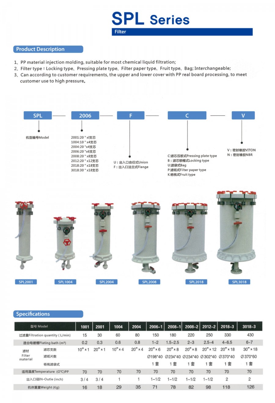 목록 FILTER - SPL Series chemical PP material injection molding, suitable for most chemical liquid filtration;Filter type : Locking type, Pressing plate type, Filter paper type, Fruit type, Bag; Interchangeable; 첨부파일 연우마그네크-1717.jpg Chemical pump, Chemical Filter.pdf 본문 목록