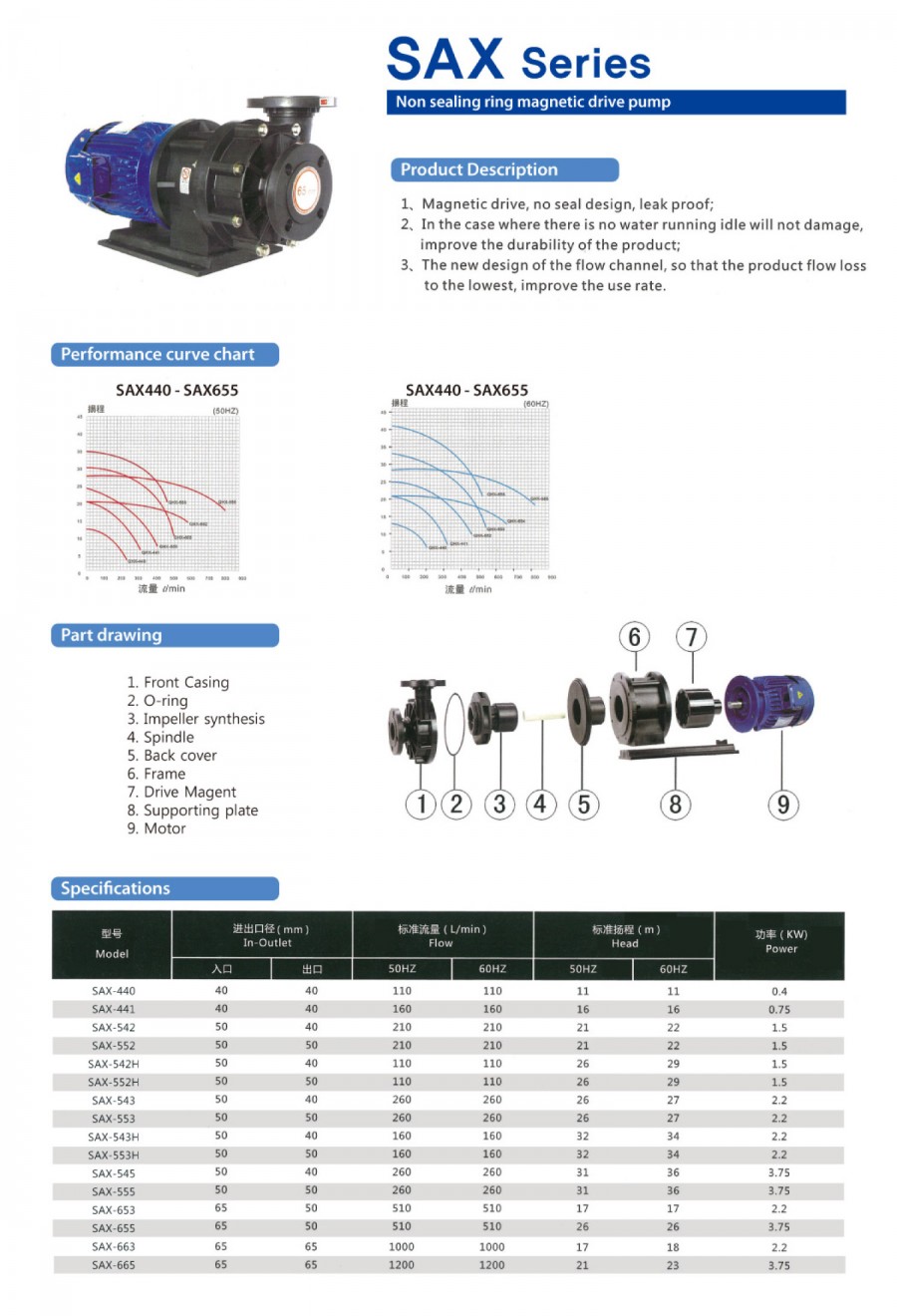 목록 MAGNET PUMP - SAX Series chemical Magnetic drive, no seal design, leak proof;In the case where there is no water running idle will not damage, improve the durability of the product; 첨부파일 연우마그네크-66.jpg Chemical pump, Chemical Filter.pdf 본문 목록
